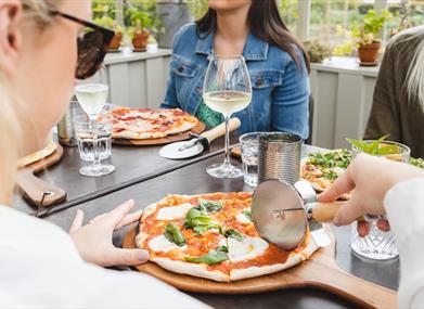 A Victorian style Glasshouse serving stone baked pizza, drinks and cocktails, is the closest building to shoreline.