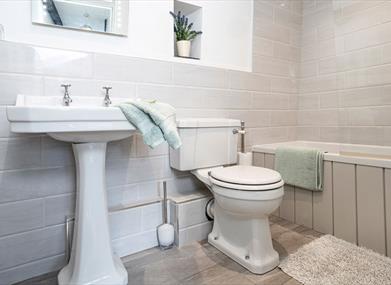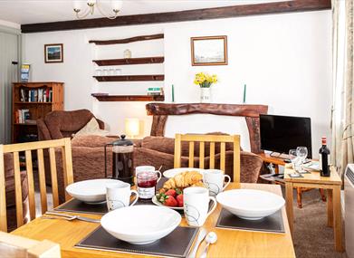 The cottage sleeps 4 in one double bedroom and one twin room upstairs and a cot for a baby, the living room/dining area/kitchen and bathroom are downstairs. There is a TV and DVD player in the living room along with comfortable seating, and a dining table. The kitchen has an electric hob and oven, fridge and small freezer, microwave and dishwasher. The washing machine and dryer are located in the laundry room. The bathroom has a bath with overhead shower, WC and washbasin and underfloor heating.