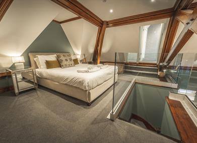 Just off the living area is a flexible ensuite bedroom, which can be arranged as twin beds or a super king. Like the living room, it also has direct access to the balcony. Above the living space, nestled within striking pitch-pine beams, is an impressive mezzanine sleeping loft featuring a king-size bed and its own ensuite facilities.