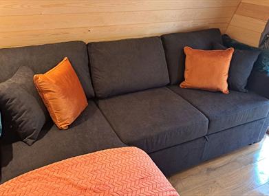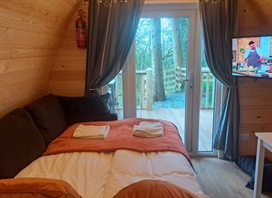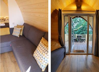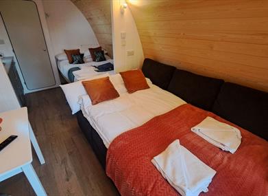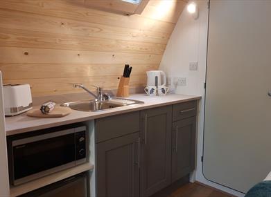The pod sleeps a max of 2 people and has a built-in double bed & sofa / chaise longue. The kitchenette is complete with cooking utensils, a microwave, sink and mini fridge, with a Velux window over the kitchen area. The dining area has an extending table with two chairs and you also have your own private bathroom in the pod, which includes a shower, sink & toilet.