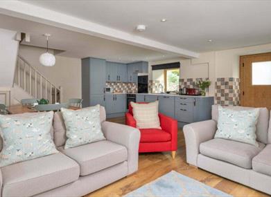 Open plan living/dining room, including fitted modern kitchen area including induction hob, microwave and dishwasher. Underfloor heating, wood-burning stove, TV, DVD player and blu-tooth speaker.