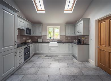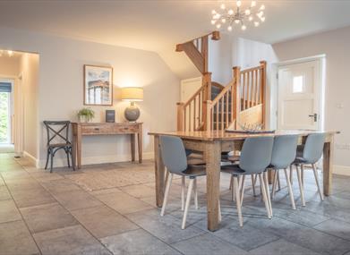 Step through the front door into a practical boot room — ideal for kicking off muddy boots and drying off your four-legged friends after a day exploring. From there, the cottage opens into a spacious open-plan kitchen, dining, and living area. At its heart is a striking double-sided wood burner, creating a warm and welcoming atmosphere that can be enjoyed from both sides of the room.