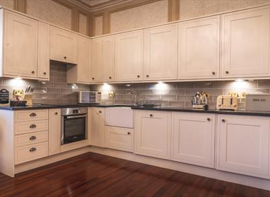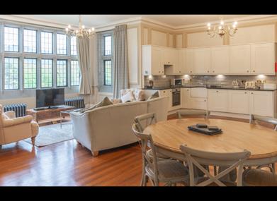 One of the apartments in the estate's Grade II listed Victorian house, Lake View exudes understated luxury. Once the private rooms of Lord Rochdale, the impressive main living space is now beautifully arranged in an open-plan design, incorporating a high-spec kitchen, elegant dining area and comfortable sitting room. Original polished teak flooring and newly installed leaded light windows enhance the sense of heritage while maintaining a refined, contemporary feel.