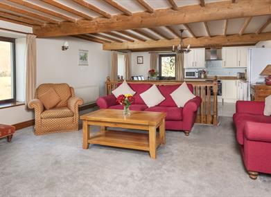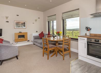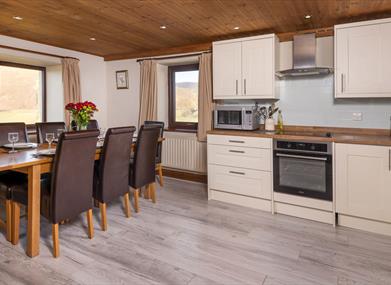 Saddleback Barn is the largest cottage, sleeping up to seven people in three en-suite bedrooms. It has a large upstairs living area with panoramic views over Blencathra.