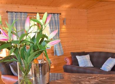 This log cabin with under floor heating, creates a cosy, snug ambience, for all year round romantic getaways or break with friends. (These can be accommodated in our additional self-catering luxury glamping, luxury shepherds hut or camp-site.)