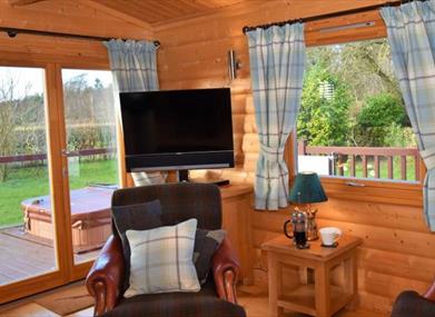 The log cabin with open plan living/kitchen/dining area & bi-folding French doors, opening onto a large decking area with sunken 'Hot Springs 'jacuzzi hot tub, open countryside & Solway Coast to the west, overlooking the Northern Lake District fells to the south, leading into private garden with outdoor furniture & BBQ for alfresco dinning!