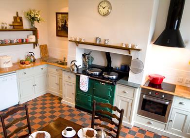 A kitchen/dining room with oil-fuelled Aga, also an electric oven and hob, American- style fridge freezer, dishwasher & microwave and a large dining table.