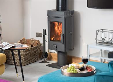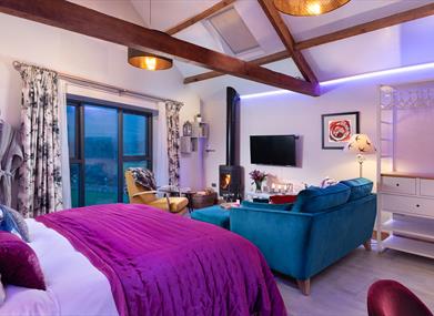 Upstairs you will find a well-spaced open plan bedroom and sitting area with feature window giving stunning views of the Pennines from bed or sofa. With underfloor heating throughout you can snuggle up in front of the log burner and set the atmosphere with the colour change mood lighting. You have a super-king bed with Hypnos mattress and Egyptian cotton linen to give you that extra feeling of luxury. You also have an LED TV with Freeview channels and Netflix, and a Bluetooth Bose speaker.