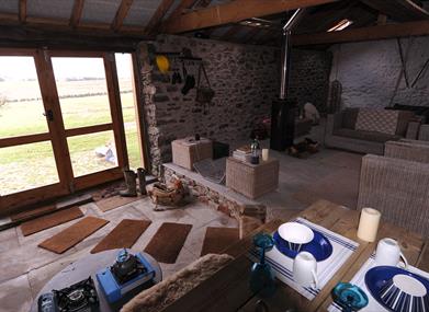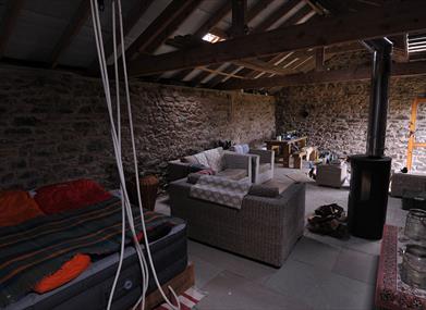 The Bothy has an inviting log burning stove set in the centre of the single room accommodation, as we have no mains electricity light is mainly by candle light which just enhances the ambiance of the building. We do have a small solar panel which when weather permits provides enough power to charge a mobile phone or i-pad if needed and some interior lighting. Water is sourced by our water butts and cooking is by our Gaz camping stoves, which are also used to heat water for washing. Seating is a rustic ratten cane sofa and chairs and the dining area has a large wooden kitchen table with bench seats. There is a Sealy double blow up mattress and a single mattress, but please bring your own sleeping bags no bedding is provided. In a separate building next to the Bothy is a wood store and compost toilet. In our nearby barn/shed there is a hot water shower which could be made available by arrangement.
