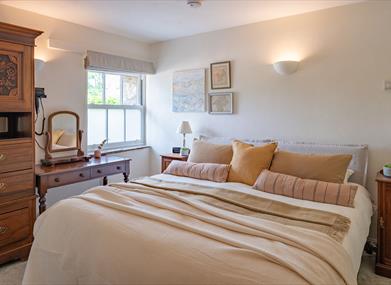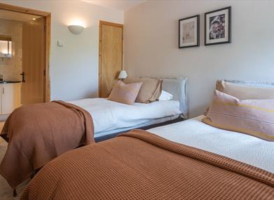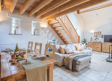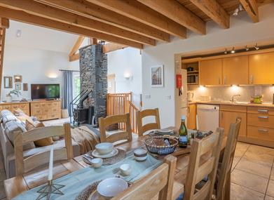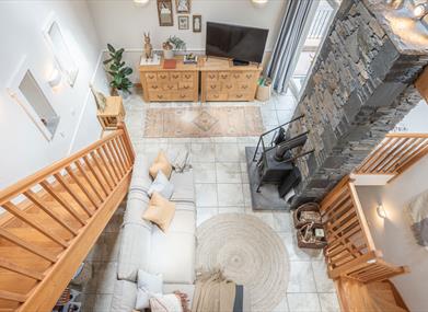 The Byre has an upside-down layout, sleeping 4, with both bedrooms on the ground level (each is en-suite with whirlpool bath), open plan kitchen/living and additional mezzanine level.