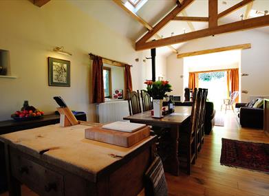 The first floor is open plan with a kitchen at one end, dining area in the middle and lounge area with Smart TV, wood burning stove and two leather sofas at the end with the large opening which was the barn doors.
