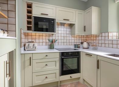 The living space is equally refined, with plush furnishings and large windows framing the estate’s lush greenery. While the kitchen is compact and perfectly formed, the real draw lies just outside your door: the breathtaking gardens of Lingholm, leading directly to the serene shores of Derwentwater.