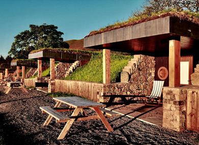 Glamping Burrows (Sleeps 2 adults + 4 children) –large underground living spaces with amazing views over the Ullswater valley. Each Glamping Burrow is superbly insulated, energy efficient, secure and virtually invisible in our gorgeous Lake District landscape unless you know where to look. WC, small kitchen, large covered deck.