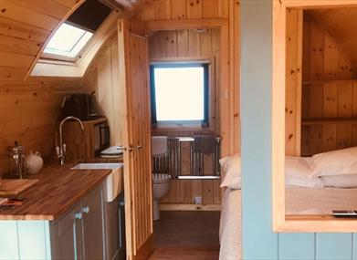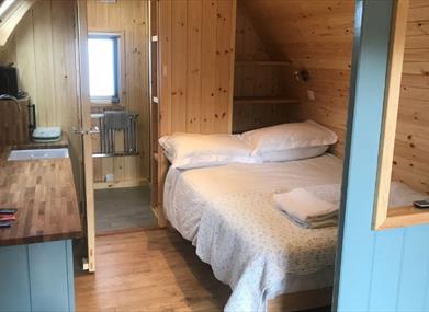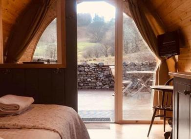 Glamping Cabins (sleeps 2 adults) - offer a touch of luxury while allowing you to experience the best of outdoor living in the heart of the Lake District. Sprung double bed, gorgeous cotton sheets, duvet and pillows, WC, basin, shower and towels, Simple kitchen including plates, cups, cutlery, bowls, microwave, kettle, toaster, fridge and sink, Large covered, outside wooden deck with picnic table or table and chairs.
