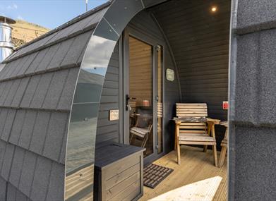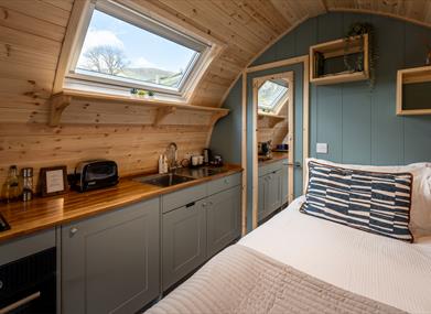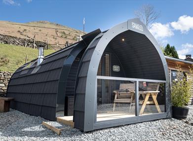 Even in the heart of the countryside, modern conveniences aren’t forgotten. The pods are fully equipped with Wi-Fi, 13-amp and USB sockets, and a Bluetooth radio to set the mood. Outside, a now-covered private seating area overlooks the stunning Helm Crag and Steel Fell - an ideal spot to enjoy a glass of wine while watching the sunset and the new terrace will now protect you from the ever-changing Lake District weather. And don’t be surprised if a curious Herdwick sheep or cheeky chicken wanders past to check in on your stay.