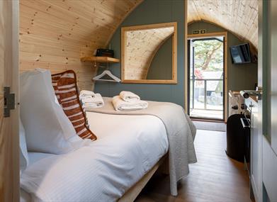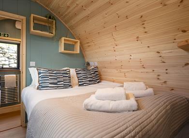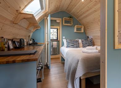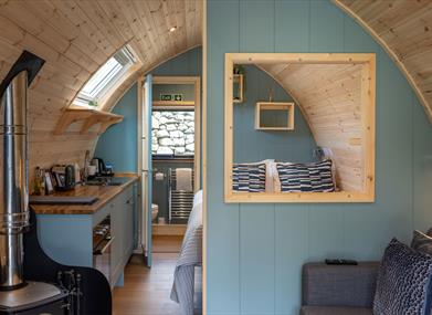 In March 2025, we replaced both of our Lake District pods with brand-new, upgraded versions, designed for even more comfort and style. Fully insulated and heated, they’re made for year-round stays. Inside, the warm wood-clad lounge features a log-burning stove, a comfy sofa, a dining table for two, and a Smart LED TV - perfect for unwinding after a day outdoors. Behind the lounge, a well-equipped kitchenette awaits, complete with an oven, induction hob, small fridge, kettle, toaster, and all the crockery and utensils you need. Prefer to skip the cooking? Our award-winning bistro is right here on-site, serving up breakfast, dinner, and even afternoon tea. Dine in or have your meal delivered straight to your pod - because nothing says luxury like having dinner arrive at your door.
