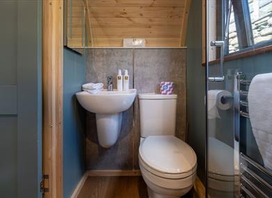 At the back, the snug bedroom nook offers a kingsize bed dressed in crisp white linen, with handy under-bed storage to keep things tidy. The ensuite bathroom comes with a rain head, hot shower (heated by our eco-friendly biomass boiler), a toilet, sink, and a heated towel rain - perfect for warming up after a chilly day in the fells. Fluffy towels and luxurious Pure Lakes toiletries are included for that extra touch of comfort.