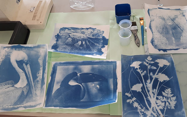 After a couple of goes, it was time to move onto animal negatives to create multiple animal-inspired images. This was where the coat hangers came in handy… After treating each piece of paper, each cyanotype needed immersing in a water bath to fix the image and then hanging up to thoroughly dry out before the final stage.