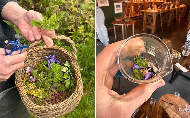 Armed with a wicker basket, Zoe takes us to a couple of nearby locations that provide a treasure trove of local plants, flowers and herbs. Zoe’s knowledge of botanicals is second to none and she explains the different plant properties, seasonal variations and local specialities that go into making the premium small-batch products that Shed One produces. Next, we head back to the Shed to get botanical-busy!