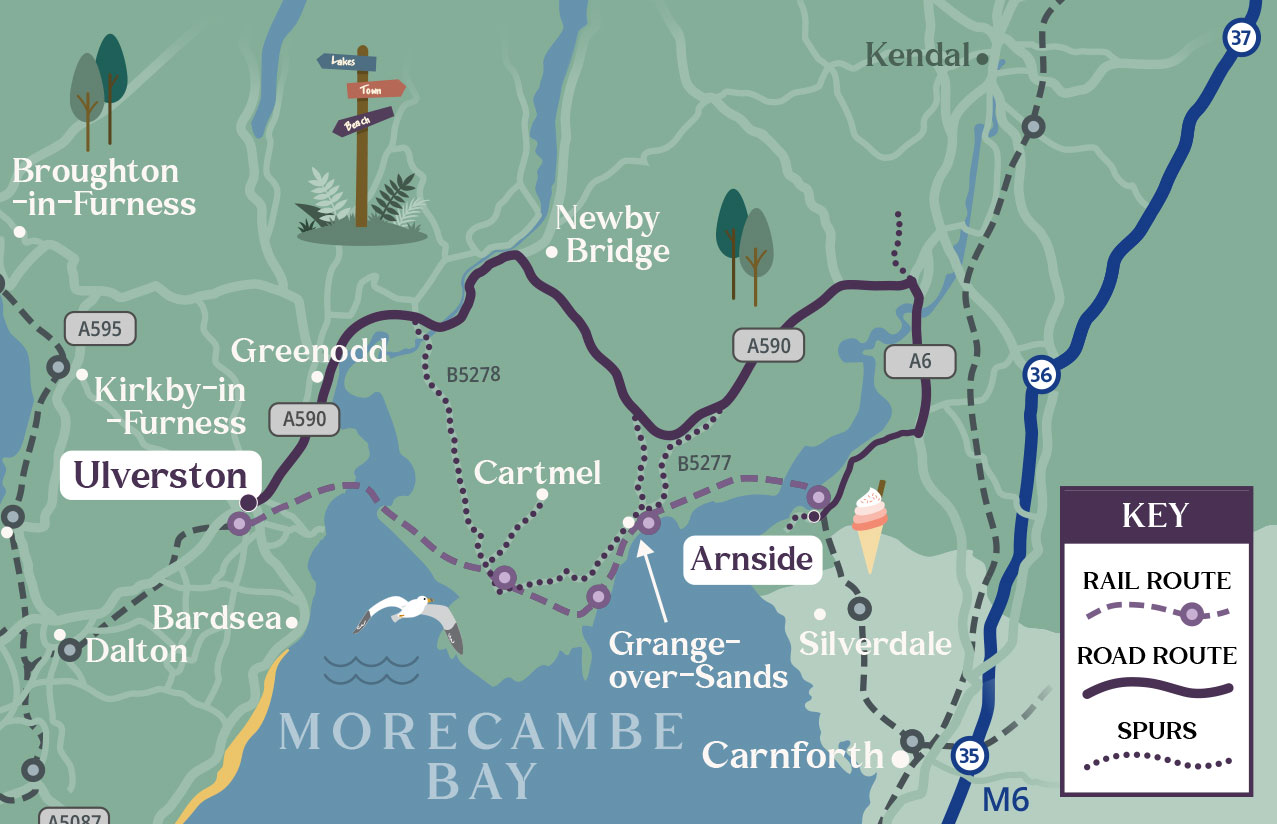 Beginning just off Junction 36 of the M6, this stretch of the Cumbria Coastal Route introduces you to the ever shifting landscapes of Morecambe Bay - a striking area of pretty towns and villages, fantastic food and drink, and an abundance of things to see and do.