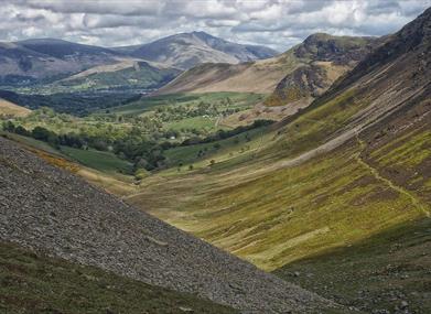After climbing the Langdale Pikes, Bowfell, Great End, Scafell Pike and Scafell, the route drops down into Wasdale. Next comes a circuit of the mountains surrounding Wasdale Head, taking in Yewbarrow, Red Pike, Steeple, Pillar, Kirk Fell and Great Gable, before descending to the top of Honister Pass. Finally, the trail leads you up Dale Head, Hindscarth and Robinson before returning to Keswick.