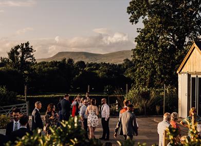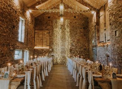 Our traditional 200 year old Westmorland stone barn, draped in twinkling fairy lights, is the most enchanting and unique place to be married. This beautiful building is packed with rustic charm from the giant chandeliers to the exposed stone walls, limestone flagged floor and vaulted ceiling. Outside there are expansive views of the Pennine hills, which you can enjoy from our landscaped outdoor areas, as well as the undercover terrace. Perfect for taking in golden hour, and watching the sun go down over the fields. In addition there are two licensed outdoor areas to be choose to be married; the outdoor handcrafted pavilion, or our meadow by the stream.